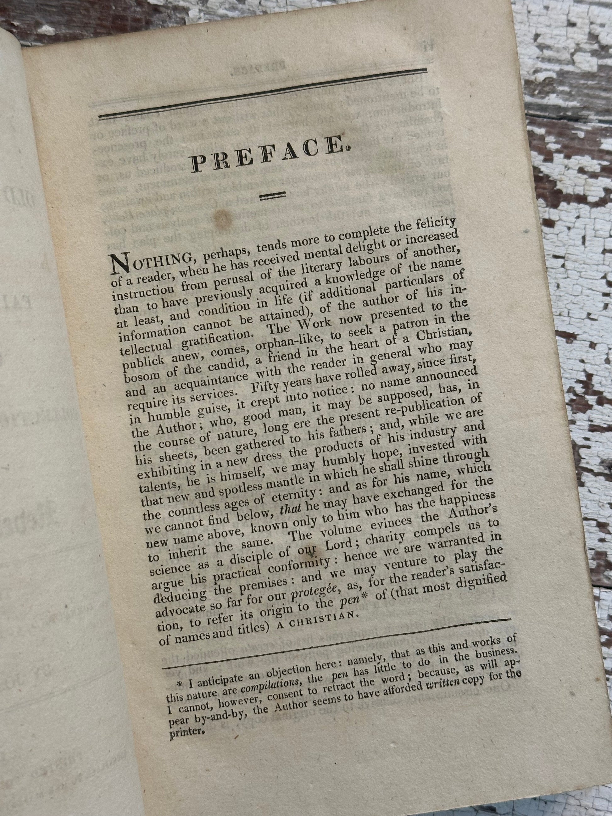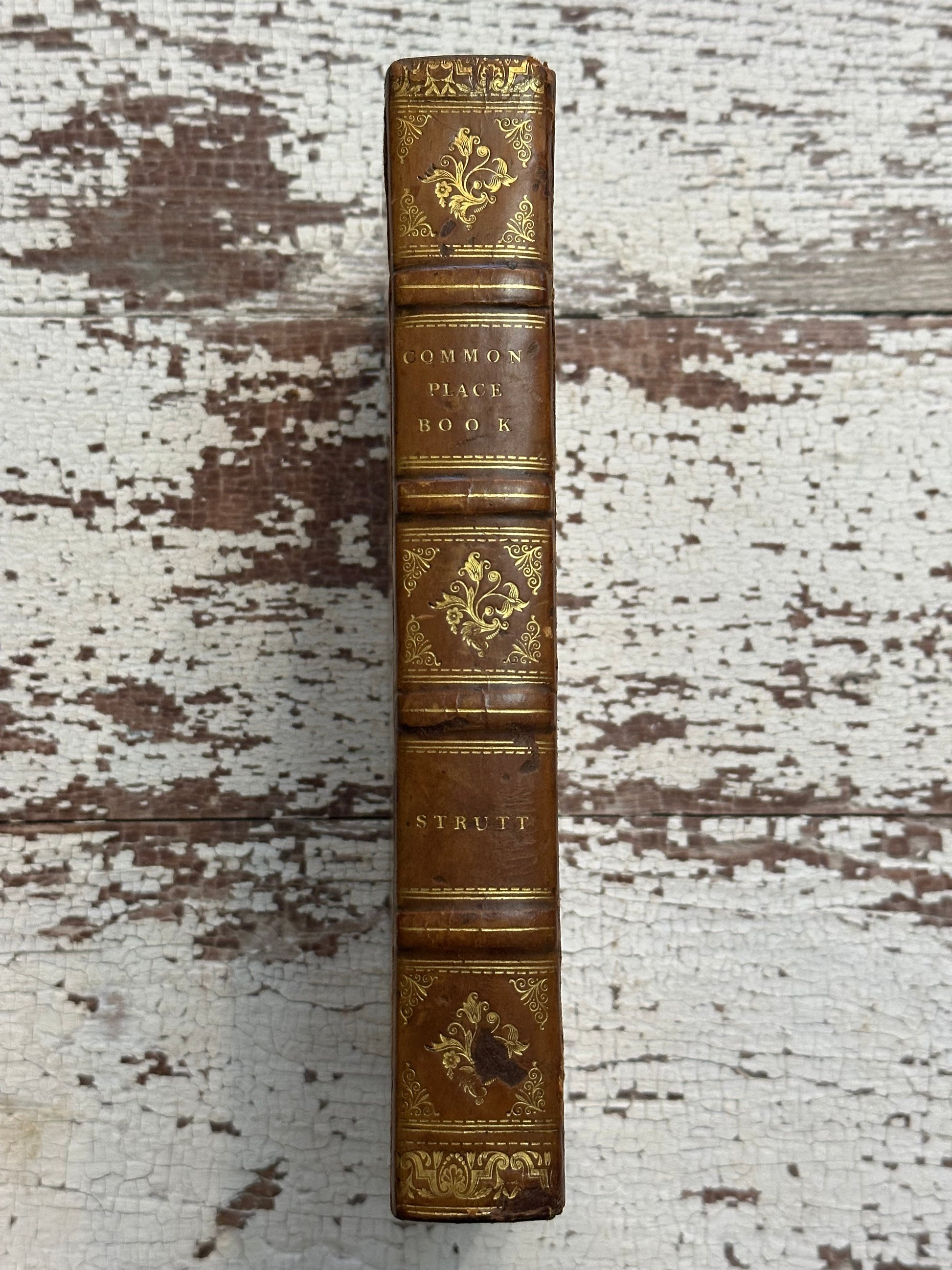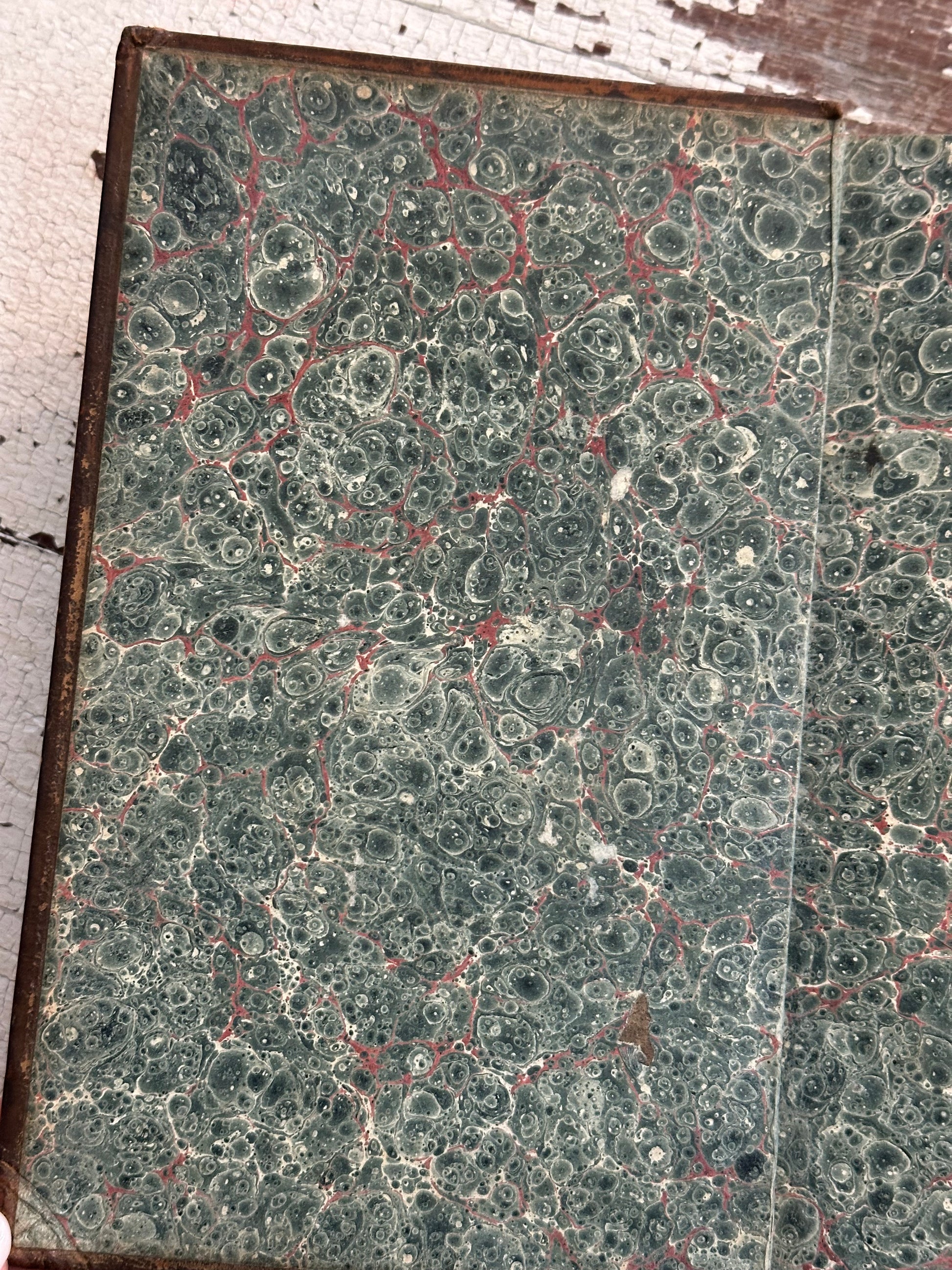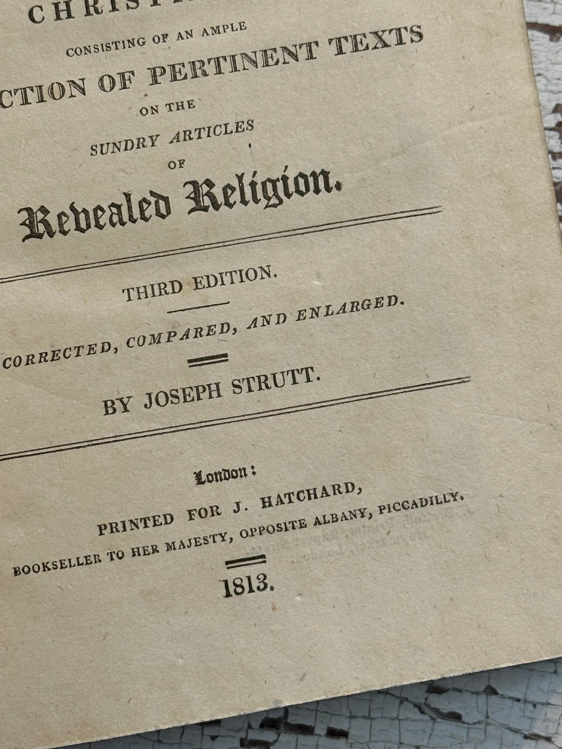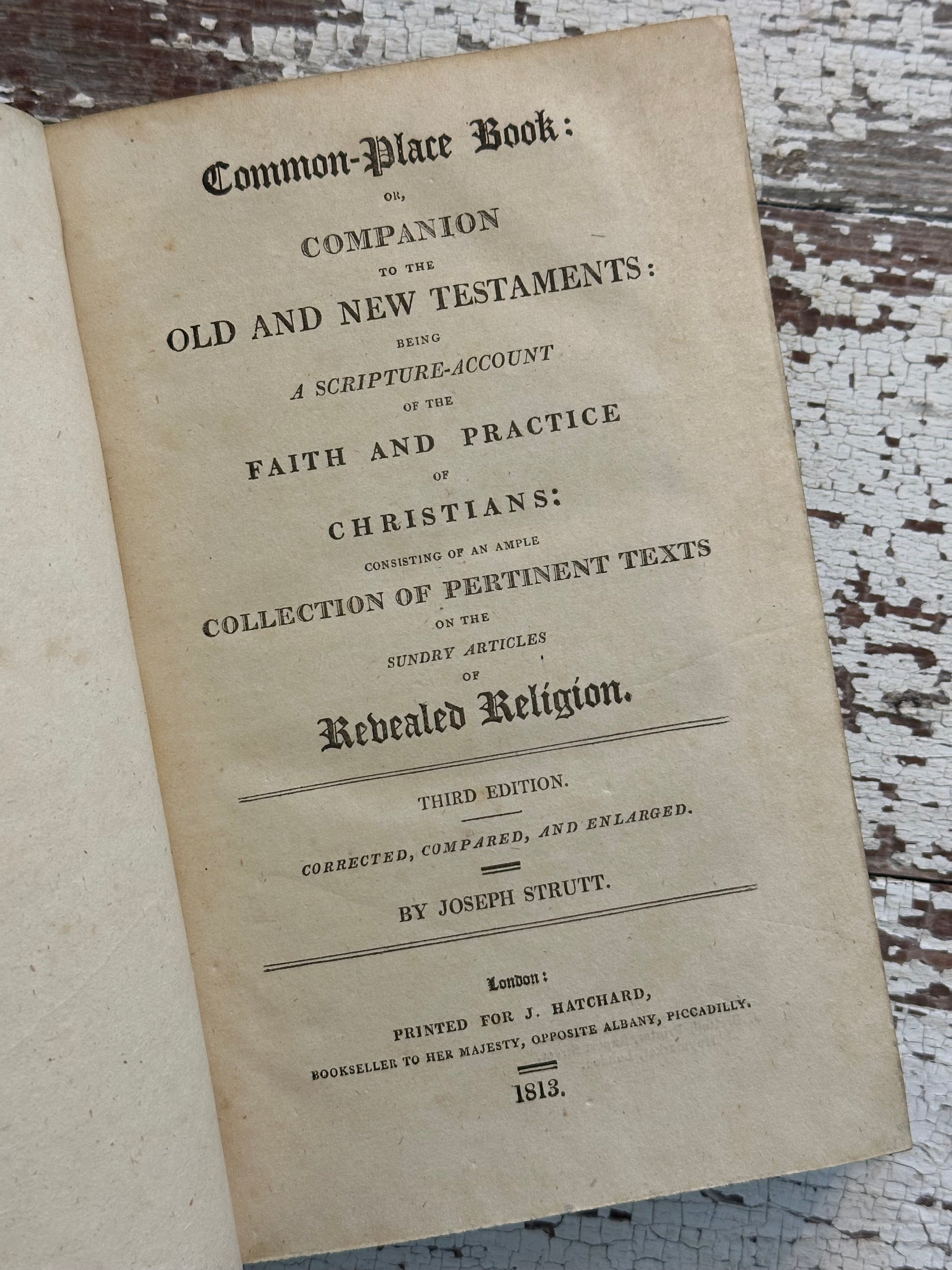 1813 The Common Place Book: Or, Companion to the Old & New Testament: Being A Scripture Account of The Faith & Practice of Christians: Consisting of an Ample Collection of Pertinent Texts on the Sundry Articles of Revealed Religion by Joseph Strutt. This was published in London for J. Hatchard, Bookseller to Her Majesty. It is bound in full calf leather… with a unique “diced calf” cover! This technique was difficult to do, so it makes it special! It also has thicker paper that almost feels hand made… it is a gorgeous book!! The fore-edge has a blue marbling pattern on it.