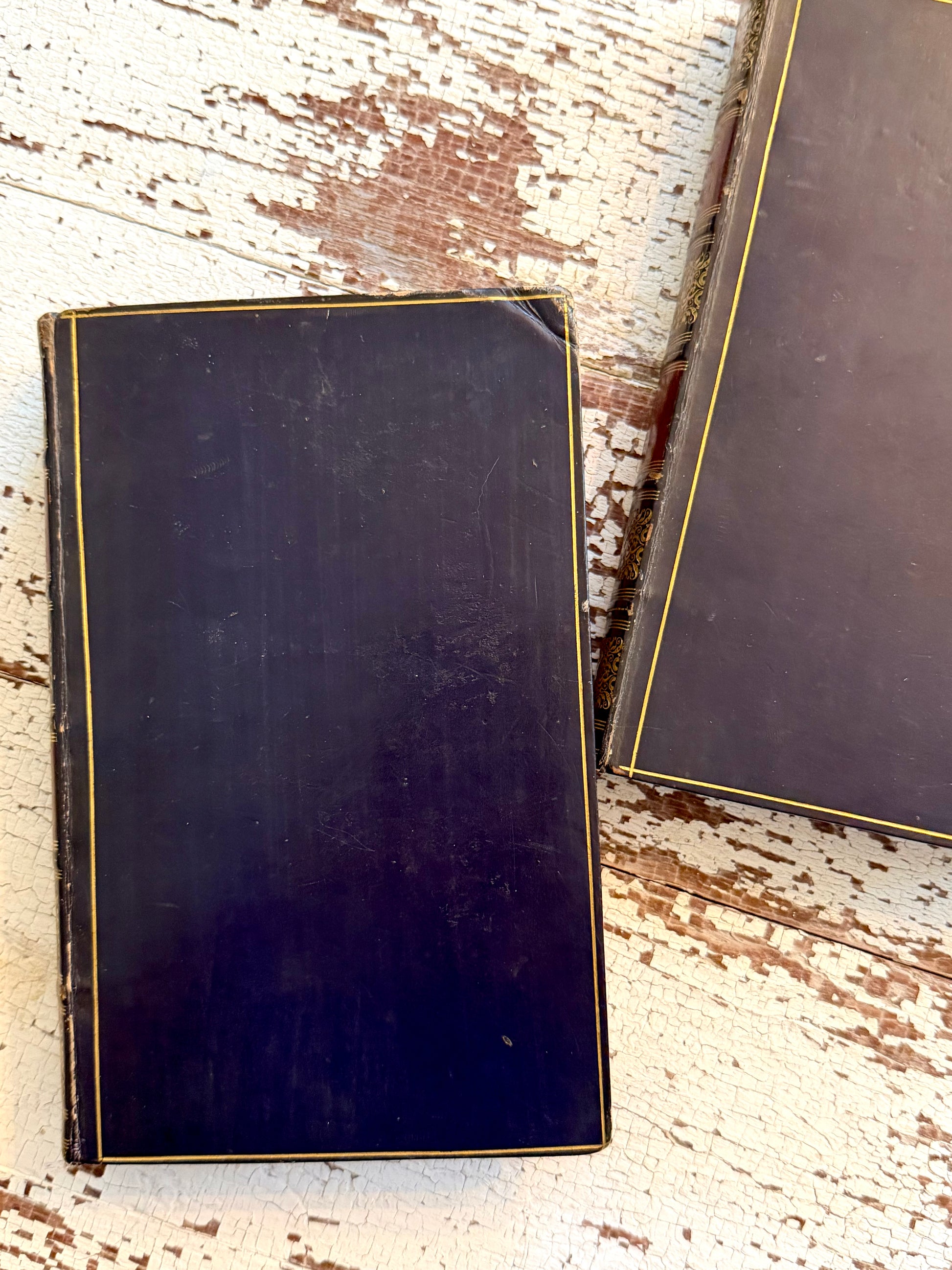 Overall they are in great condition for their age! There is some light foxing on the first pages of each book… but this is common in older books. There is also some light marks or imperfections in the leather from use over time.