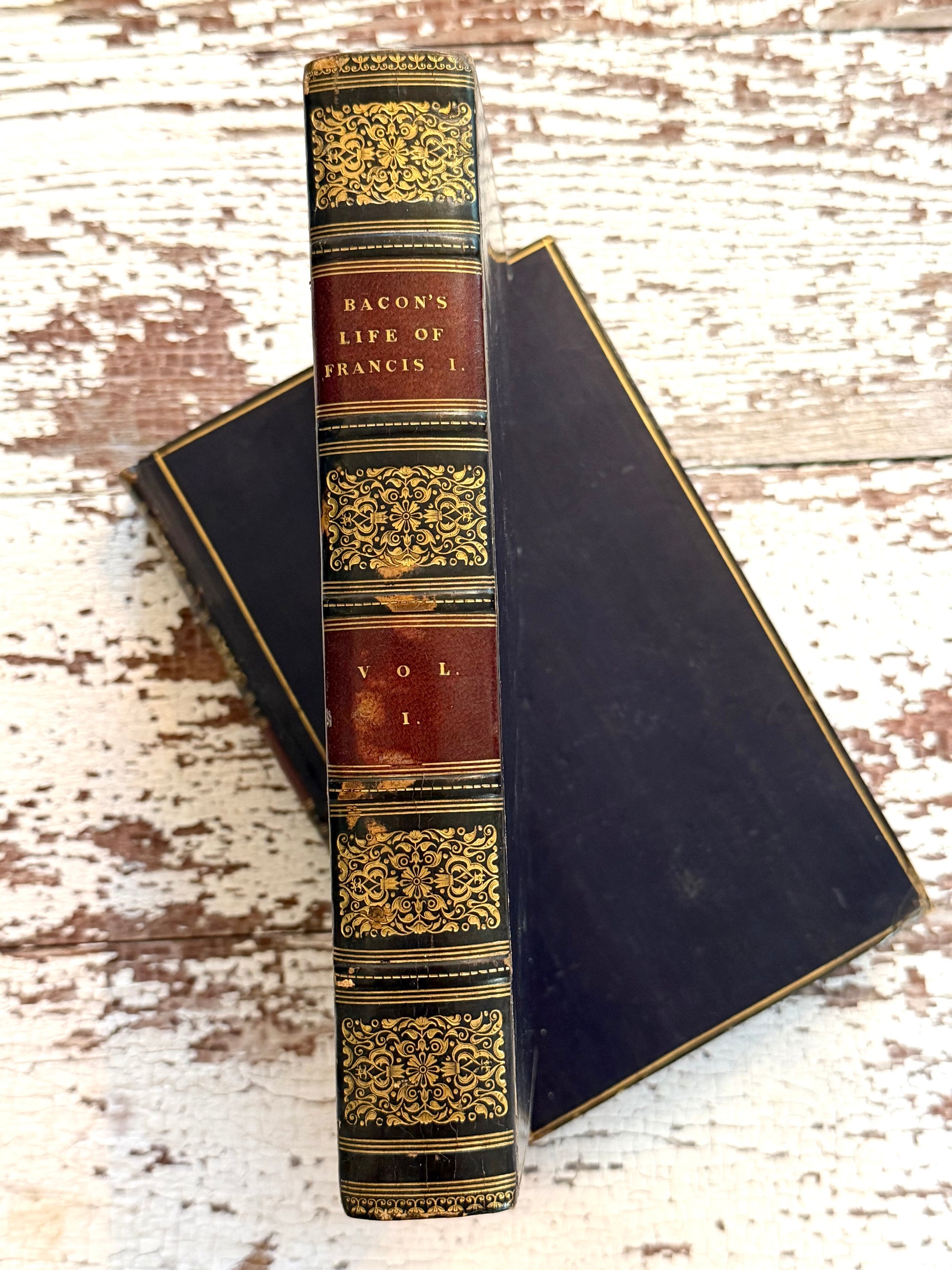 1830 Pair of The Life and Times of Francis The First, King of France by James Bacon. This is a second edition, Complete in two volumes. They are bound in full purple calf leather with decorative spines. There is one engraving of King Francis at the front of the first volume.