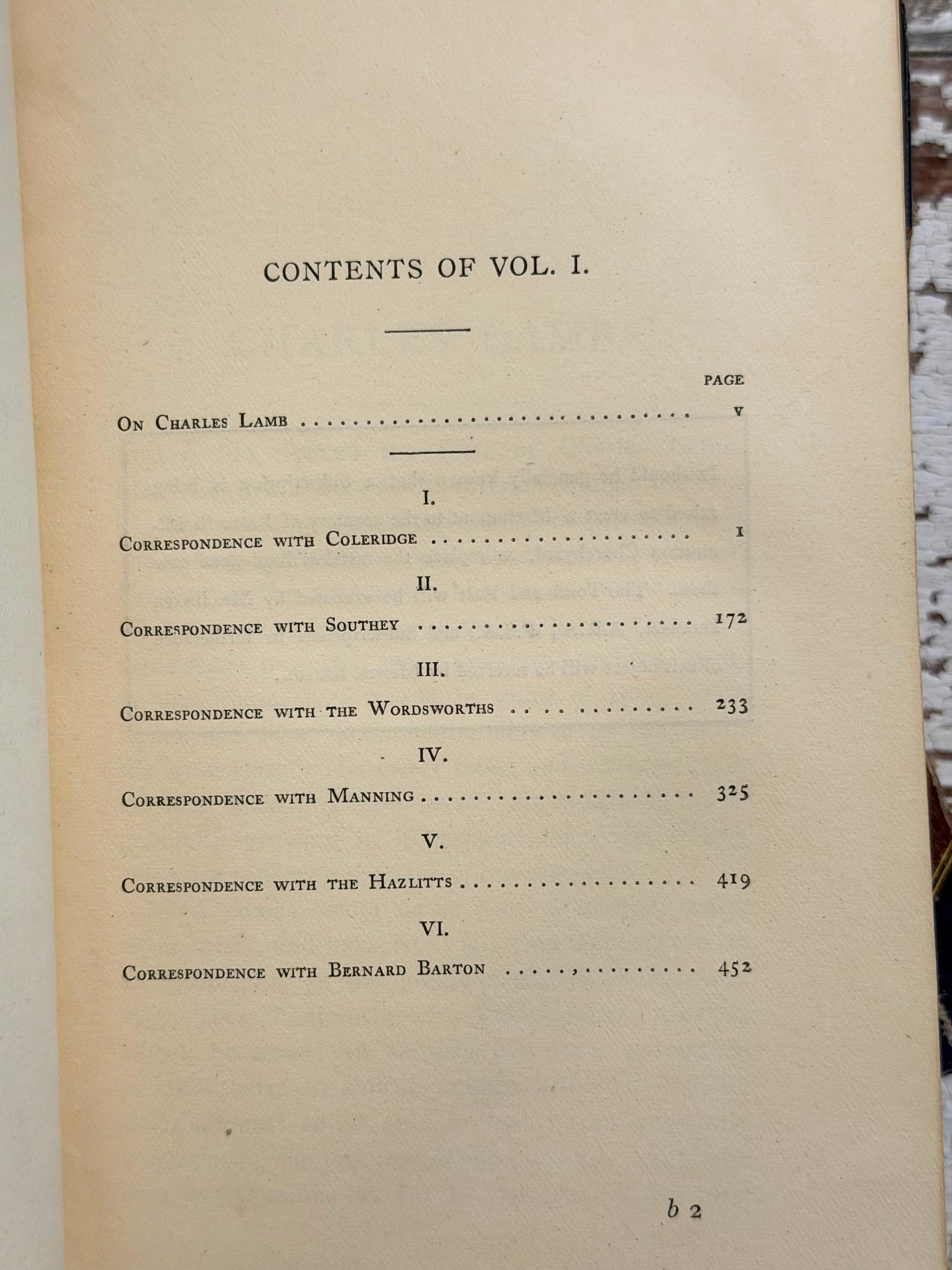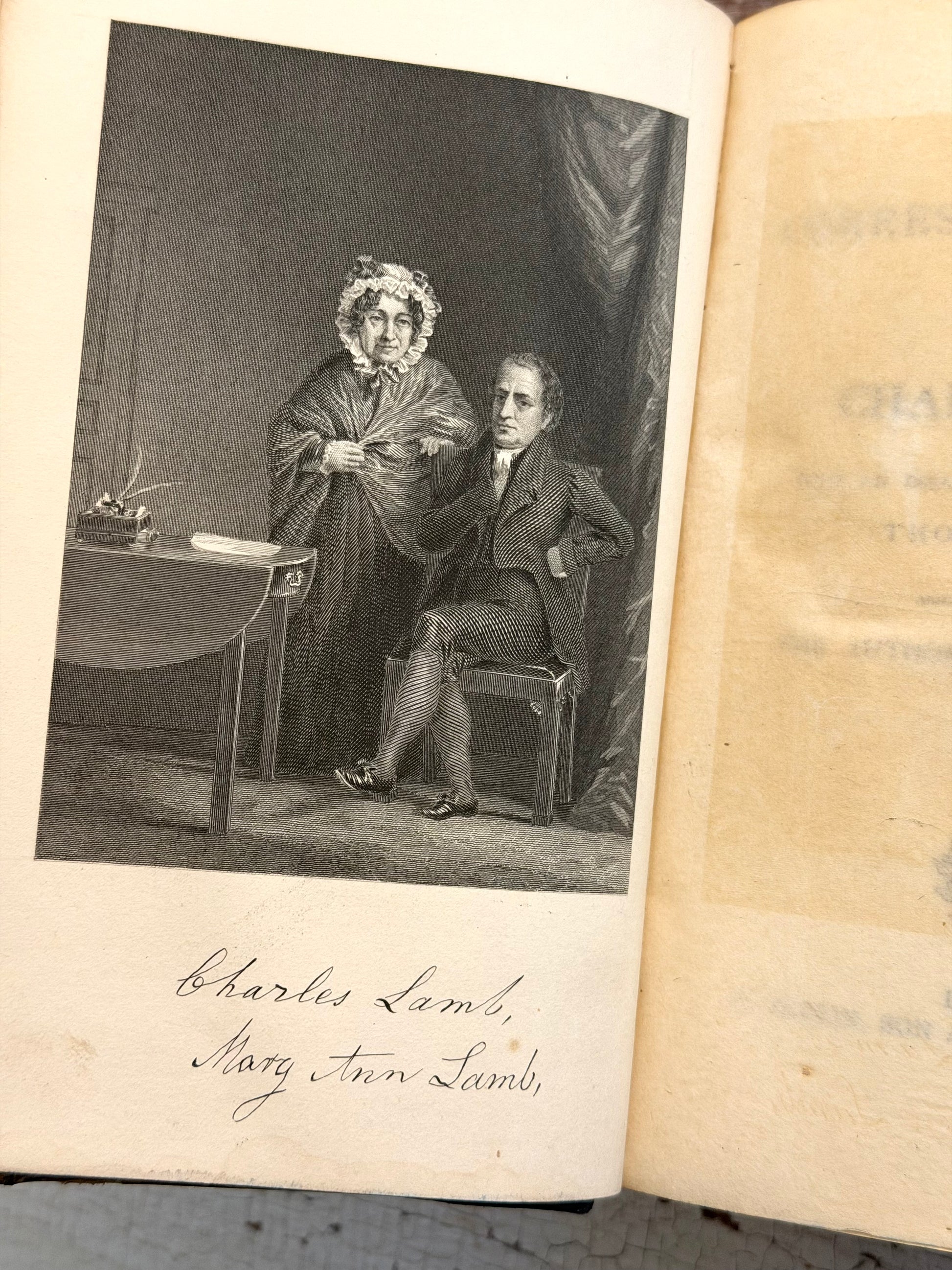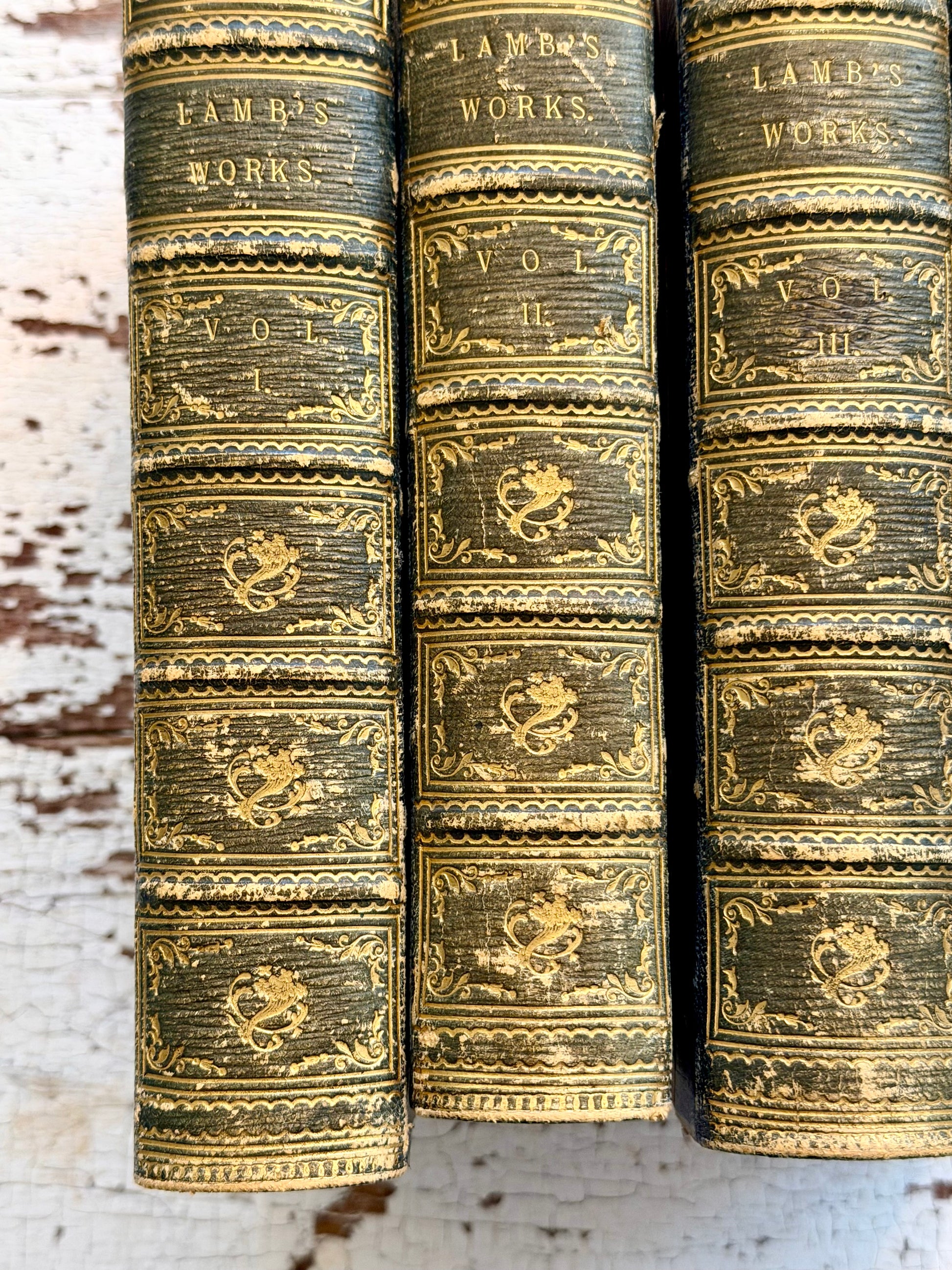 1870 The Complete Correspondence & Works of Charles Lamb; With an Essay on His Life & Genius by Thomas Purnell. Published in London by E. Moxon, Sons and Co. Volume one has a frontispiece of Charles and his sister, Mary Lamb. These have a blue straight grained Moroccan leather spine, that has faded to dark green. The spines are pretty worn from use and age, there is also some rubbing on the edges. Overall they are in good condition, all hinges are fine and they have tight bindings.