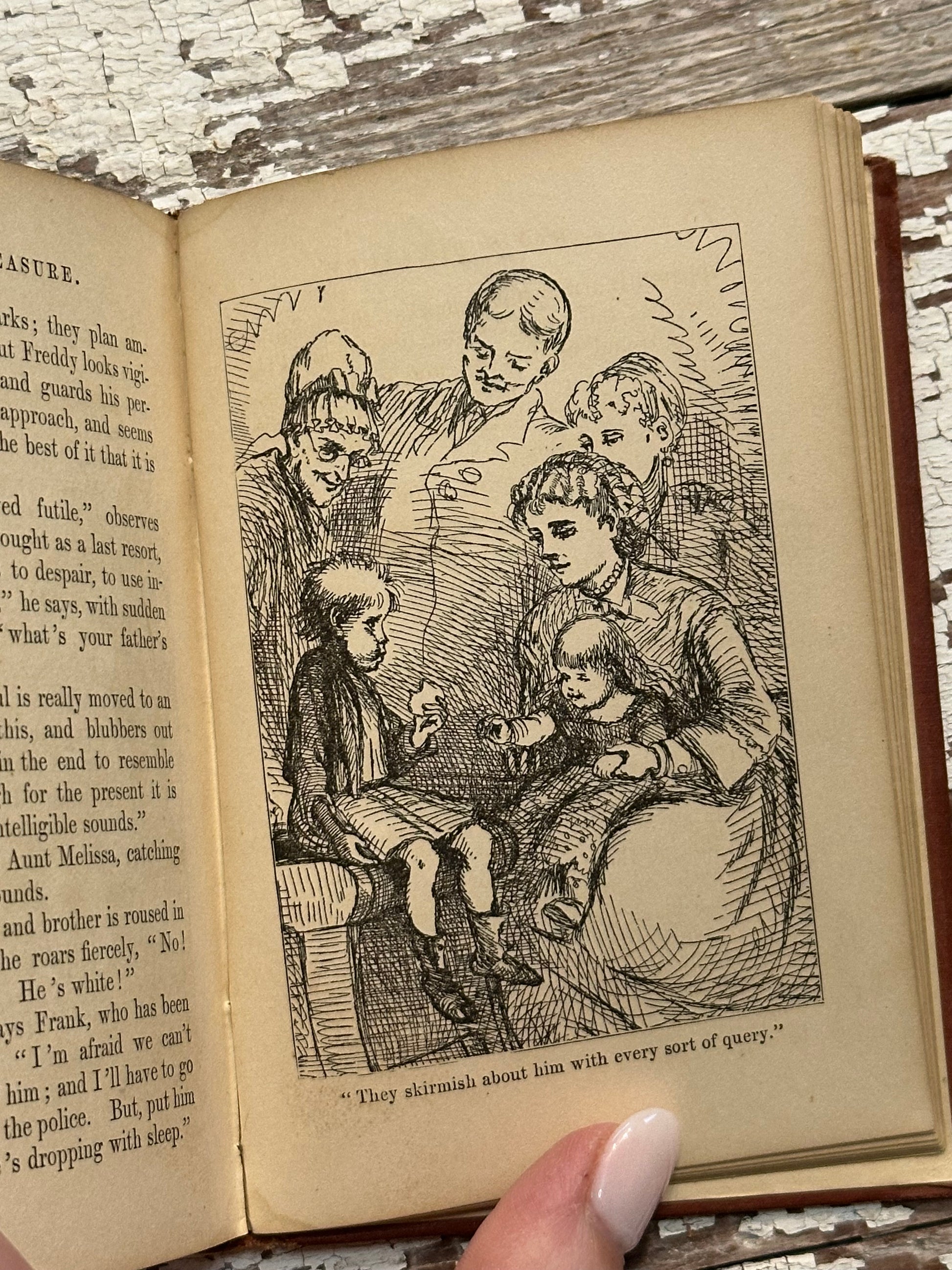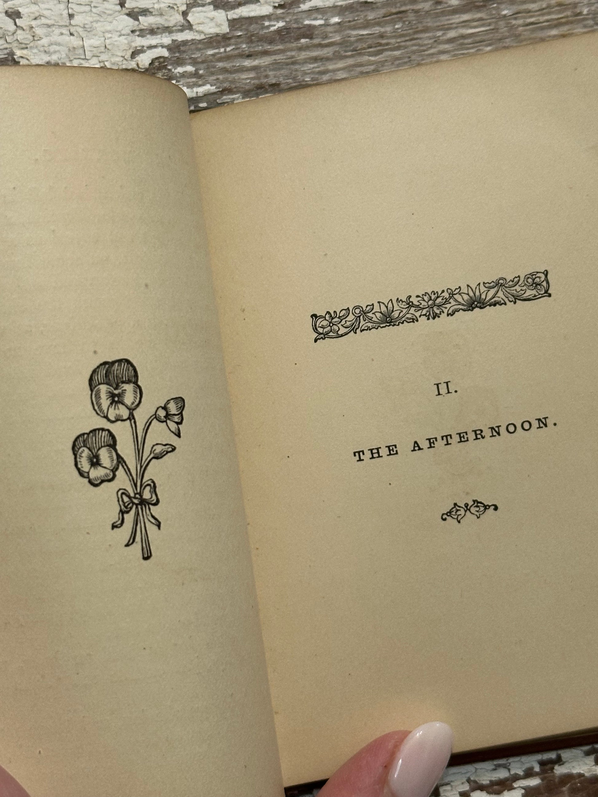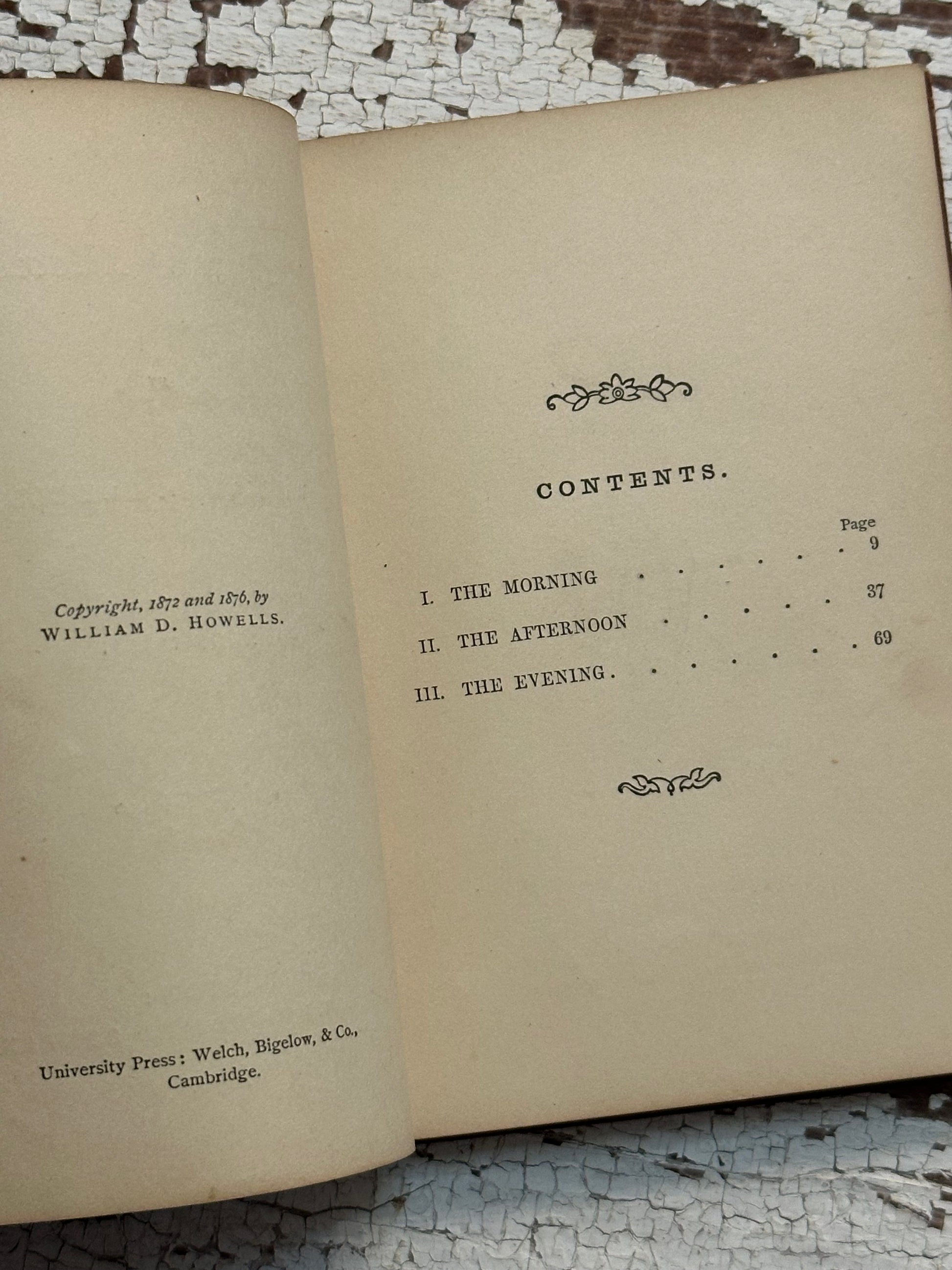 1876 A Days Pleasure by William D. Howells. This is a smaller miniature book, bound in Victorian cloth and it has a decorative cover. It is filled with little illustrations and vignettes.