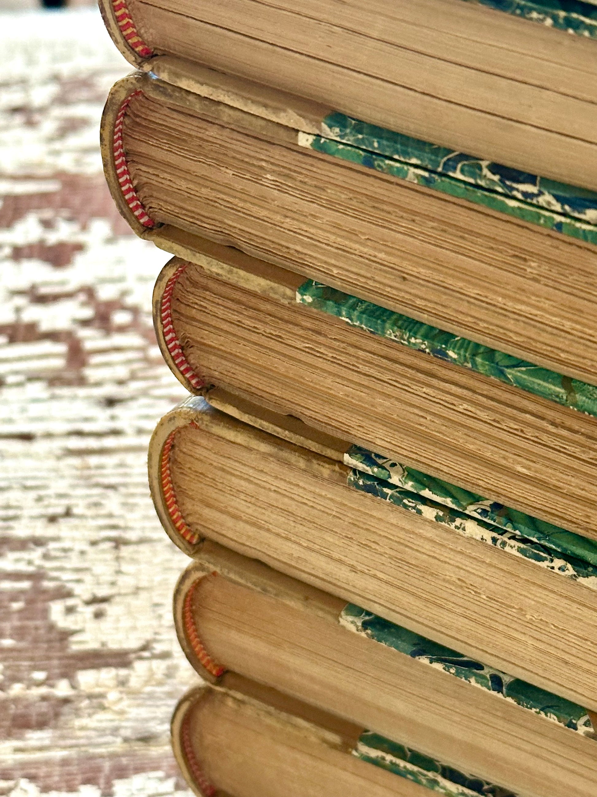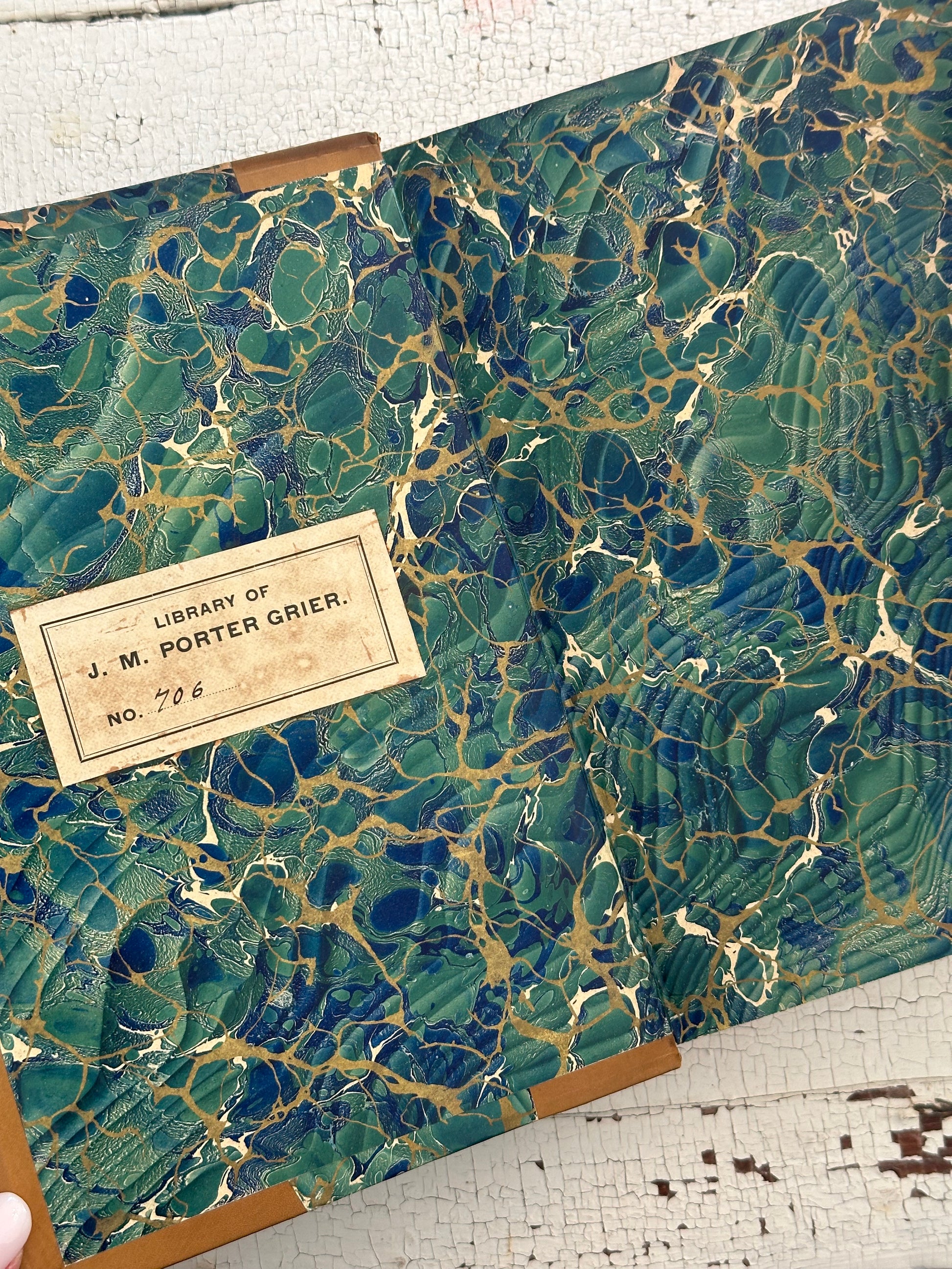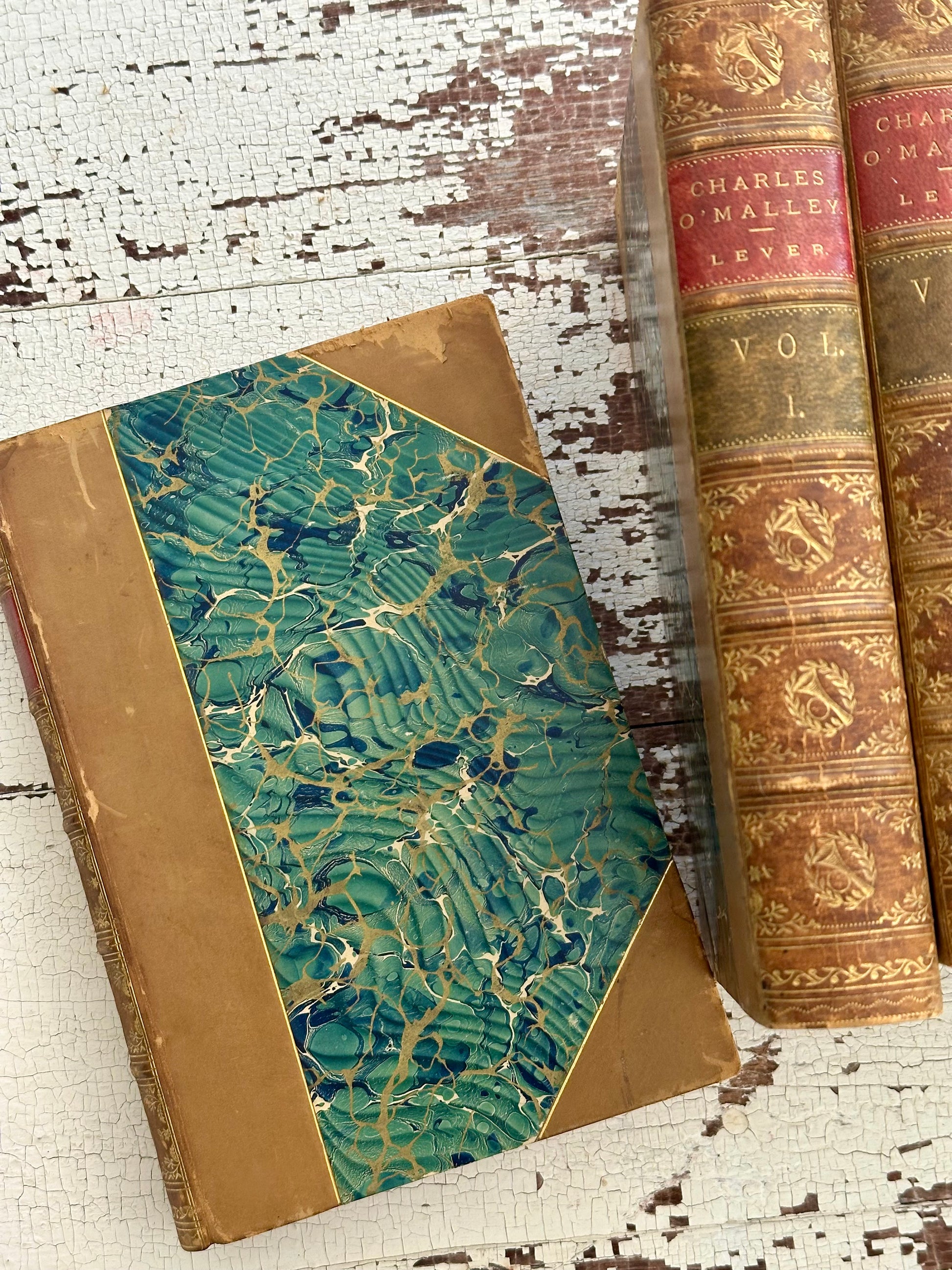 This set has the most beautiful and unique leather spines, with bugle horns on them. They also have a marbled board front and matching end papers. Overall they are in great condition for their age!