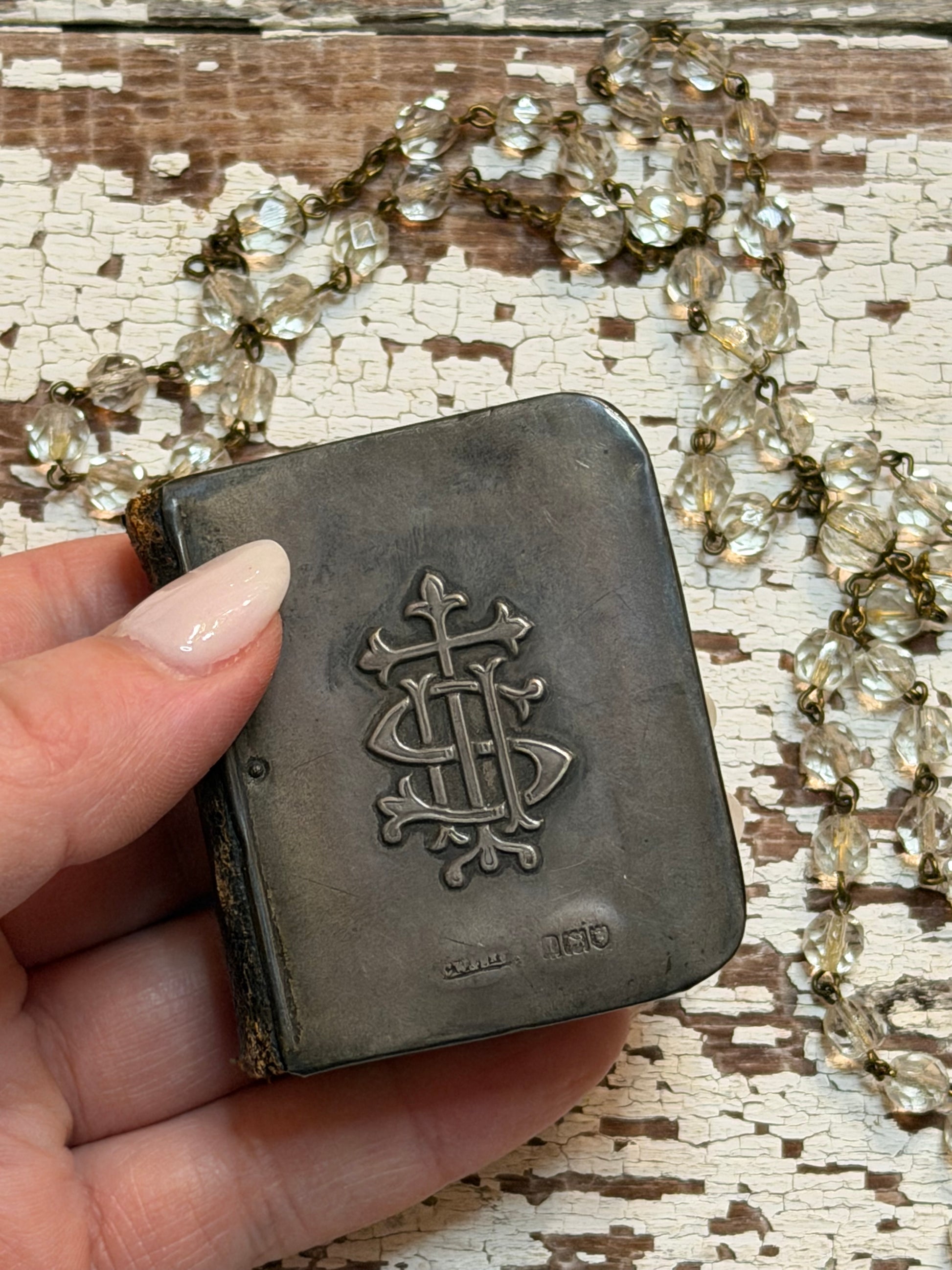 Antique Miniature The Book of Common Prayer, According to the use of The Church of England, With The Psalms of David. These were published in the mid-late 1800s, it does not have a copyright date, but I would say it is late 19th century. It is a mini black leather book with a sterling silver cover. It has a hallmark stamp on the front, confirming it is sterling. It’s also engraved with IHS, meaning “In His Service”. These are really hard for me to find or come by…. Overall it is in good condition for its age. The title page did have a tear, but it has been repaired. If you collect miniatures, these are so fun to add in with any books!