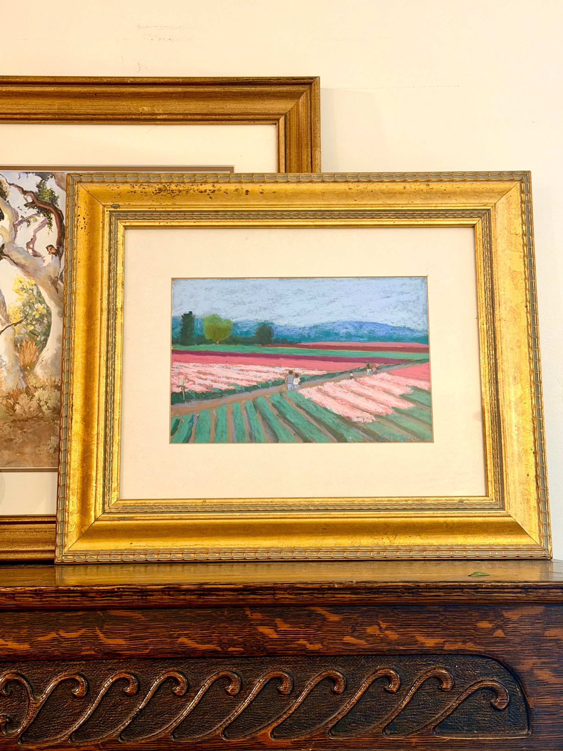 Beautiful, Original Pastel Painting done by Lorie Topinka of A Tulip Farm. It is signed by her on the bottom right. I purchased this at a high end estate years ago… they collected stunning pieces of art from local artists. It is professionally framed in a gorgeous gold gilt frame with glass.